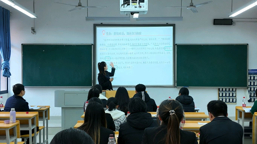 “我选择《山乡巨变》中邓秀梅动员群众入社的片段进行教学设计,”刚刚完成展示的2023级汉语言文学专业师范生金锦同学在接受采访时仍略显激动,“起初觉得红色题材小说距离现在的学生有点远,但反复研读作品后,我发现周立波先生将时代变革这样的宏大主题,通过人物个体的抉择和成长进行了生动阐释。因此,我选择从邓秀梅的语言、动作等细节刻画切入,并在收束时将邓秀梅与今天的女性基层工作者并置,让学生具象感受‘深入生活、扎根人民’的立波精神及其当代启示。我认为这对今天的青少年树立正确价值观会很有启发。”