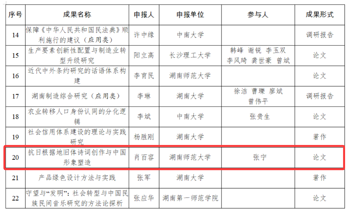 近日,湖南省委、省政府公布了第十六届社会科学奖获奖名单。我院张宁教授与湖南师范大学肖百容教授合作发表于《中国社会科学》的论文 《抗日根据地旧体诗词创作与中国形象塑造》 荣获一等奖。