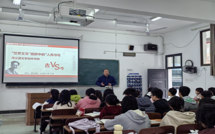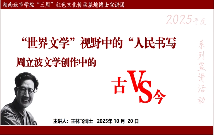 2025年10月20日,湖南城市学院人文学院“三周”红色文化传承基地博士宣讲团成功举办题为《“世界文学”视野中的“人民书写”》的专题讲座。本次讲座由王林飞博士主讲,为师生带来了一场贯通古今、连接中外的思想启迪。