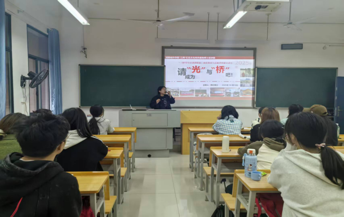 2025年10月12日,“三周”红色文化传承基地执行主任贾红博士以《请成为“光”与“桥”吧:红色文化传承中的我们》为题,向2025级新生开展主题宣讲,系统阐释基地学生宣讲团的使命愿景、成长体系与2026年度招新计划。
