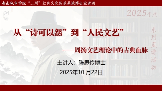 2025年10月22日,湖南城市学院“三周”红色文化传承基地博士宣讲团第五场专题讲座成功举行。陈思伶博士以《“诗可以怨”到“人民文艺”:周扬文艺理论中的古典血脉》为题,引领在场师生进行了一场穿越古今的思想溯源,生动揭示了周扬文艺理论中深植的古典文论血脉。